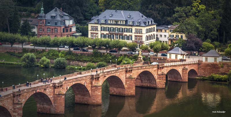 The famous 200-meter-long Karl Theodor Bridge, built in 1786, connects the old town with the right bank of the gentle Neckar River. People call this bridge Philosophenweg, or philosophers’ path.