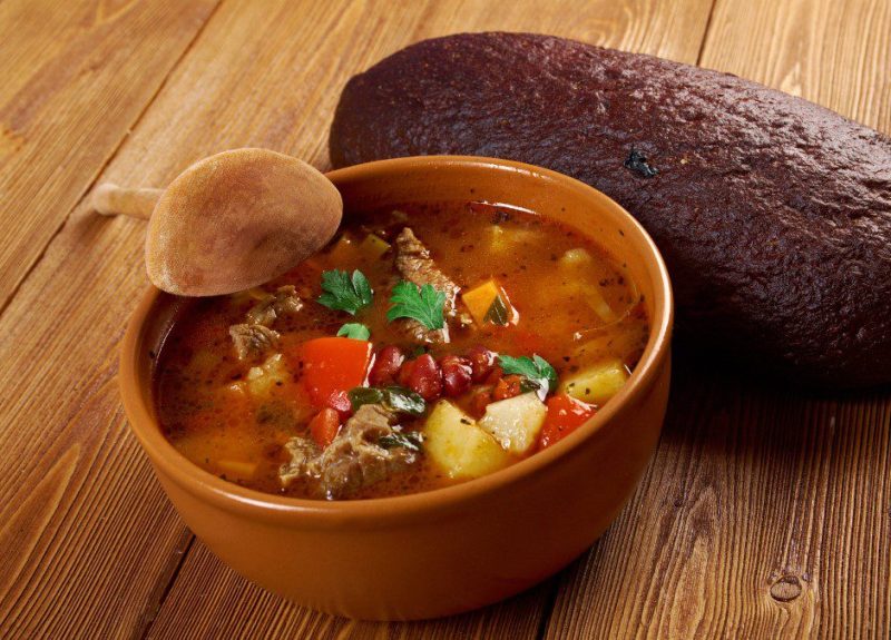 Eintopf is a one-pot stew that can include a variety of ingredients. It is a meal in one that will usually include broth, vegetables, potatoes, and meat. It can sometimes include legumes such as lentils, and it is often served mit Brot (with bread).