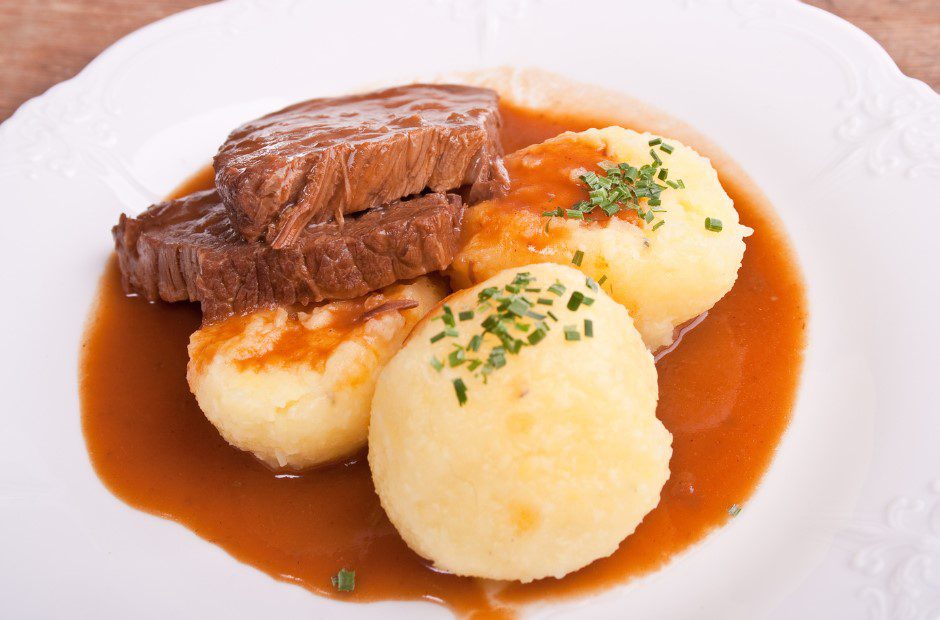 Sauerbraten is a German pot roast that literally translates to “sour roast”. The sour part involves soaking meat in a sauce similar to a sweet and sour sauce, then slowly roasting it in a dish.